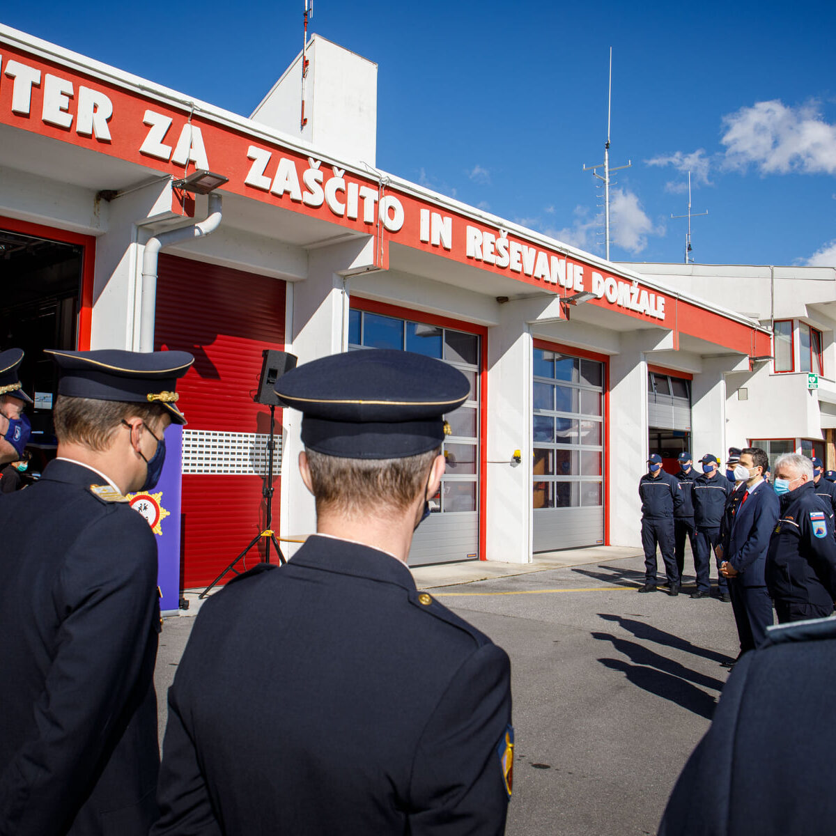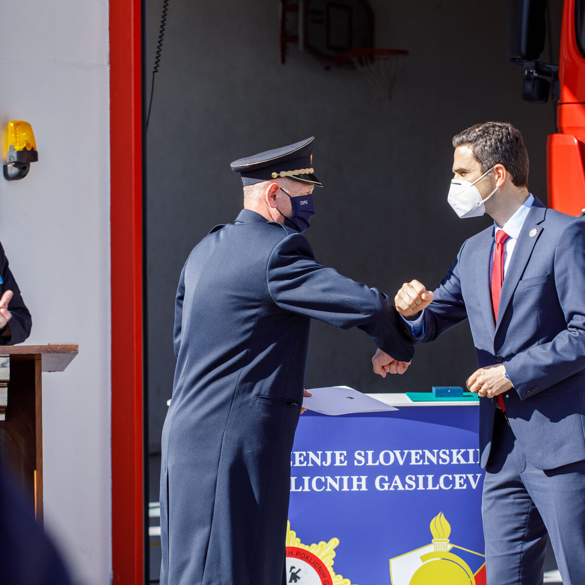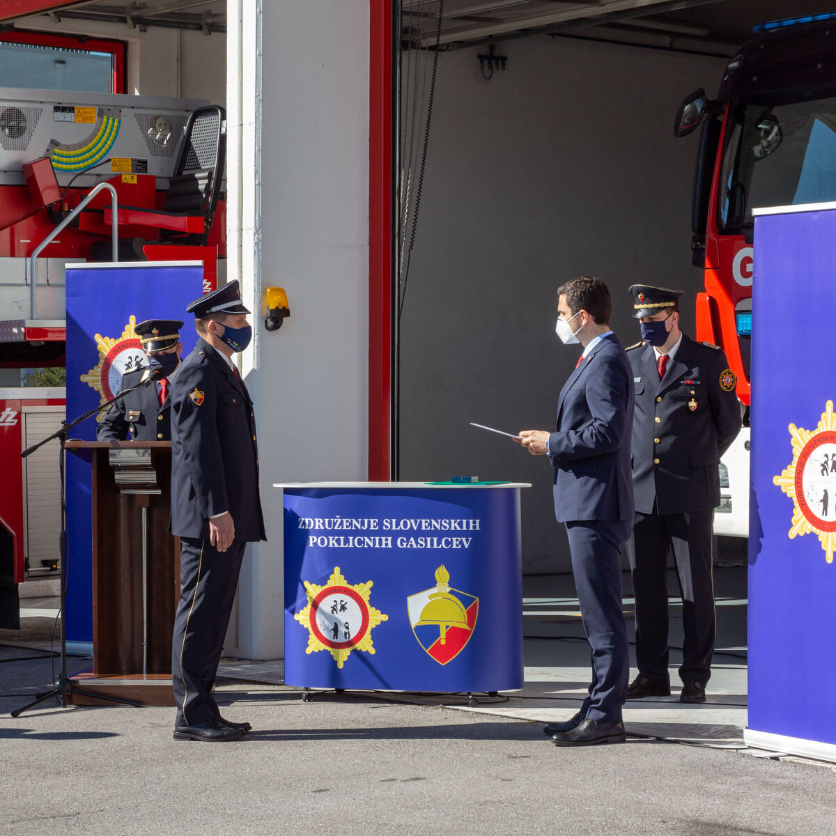 Svečani dogodek, ki je potekal v torek, 16. 3. 2021, smo pripravili zaradi Podelitve spominskega znaka “Za požrtvovalnost v boju proti COVID–19”. Na podlagi 7. člena Uredbe o spominskem znaku »Za požrtvovalnost v boju proti COVID-19« je pristojna komisija na predlog predsednika vlade Republike Slovenije g. Janeza Janše, potrdila poklicni gasilski enoti »CZR Domžale in PGE Celje » na predlog združenja slovenskih poklicnih gasilcev za prejemnika spominskega znaka »Za požrtvovalnost v boju proti COVID-19« Direktor-poveljnik PGE Krško Aleš Stopar pa je prejel priznanje CZ. Ministra za obrambo so sprejeli predsednik ZSPG Miran Korošak, direktor URSZR Darko But in direktor CZR Domžale Andrej Jarc.